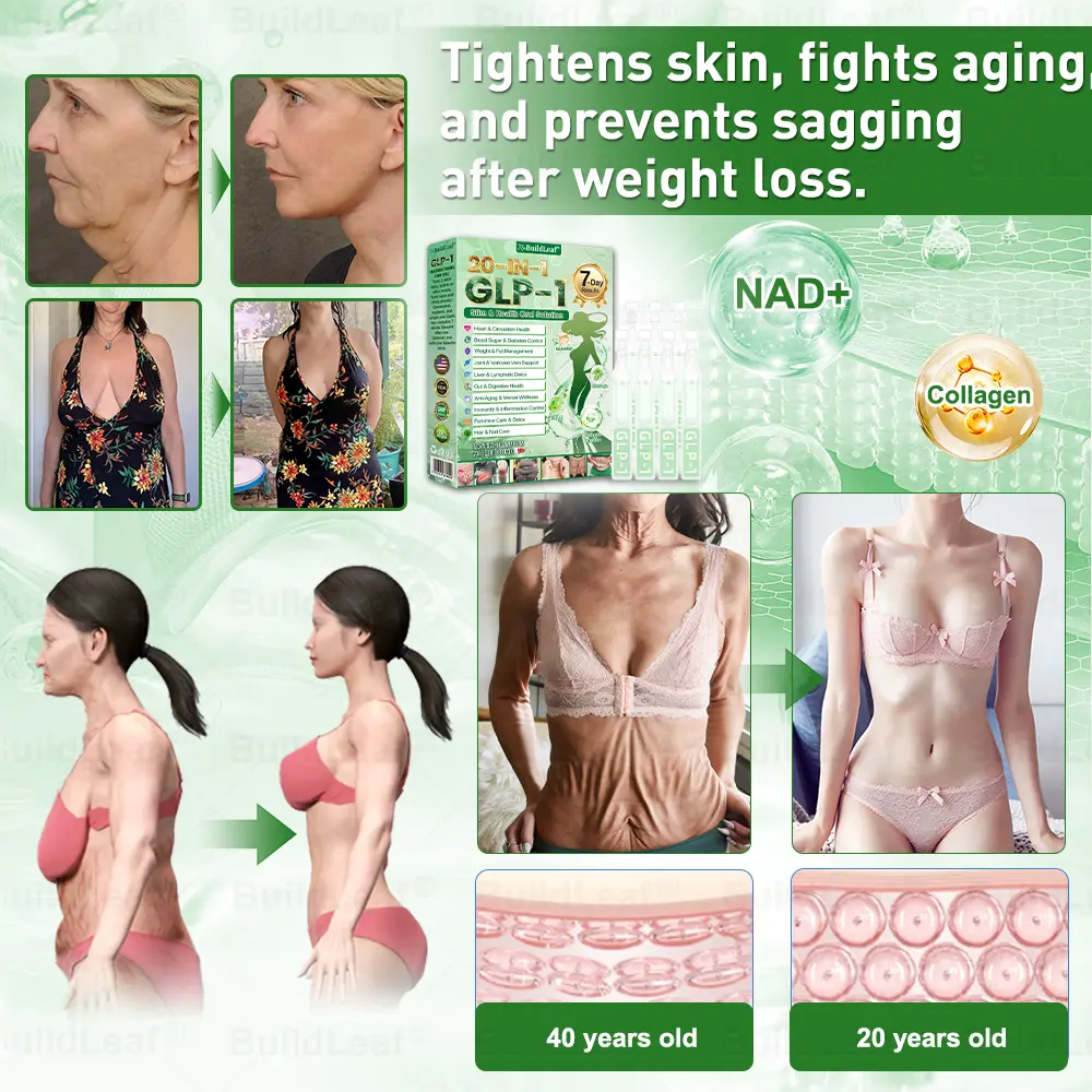 As we age or lose weight quickly, collagen loss and reduced fat support can lead to sagging, fine lines, and deeper wrinkles. Collagen peptides strengthen the skin, smooth lines, and improve elasticity; NAD+/NMN enhance cellular repair and stimulate collagen synthesis to combat aging; Omega-3 locks in moisture for long-lasting smoothness; green tea, turmeric, and moringa provide powerful antioxidant and anti-inflammatory protection; magnesium supports repair and deep hydration; and silymarin detoxifies, brightens, and restores clarity. This advanced synergy delivers anti-wrinkle and anti-aging benefits, while also supporting the recovery of sagging skin after weight loss, helping restore firmness, tone, and resilience. Clinically proven: Within just 4 weeks, over 82% of users experienced improved hydration, smoother fine lines, firmer skin, and visible lifting โ regaining a youthful, sculpted appearance even after weight reduction.